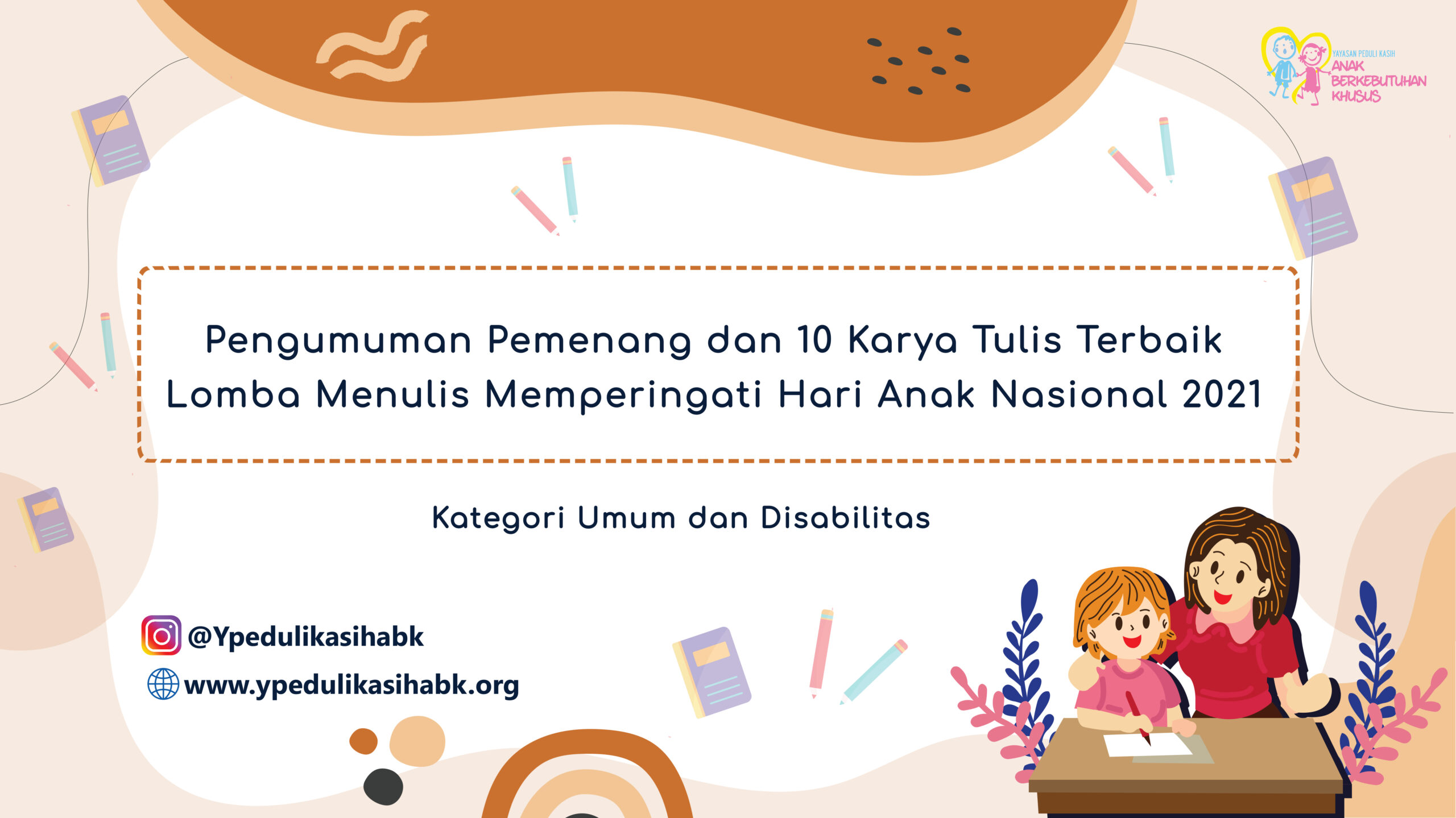 Dalam rangka memperingati Hari Anak Nasional 2021, Yayasan Peduli Kasih Anak Berkebutuhan Khusus mengadakan Lomba Menulis dengan tema: Harapan Anak