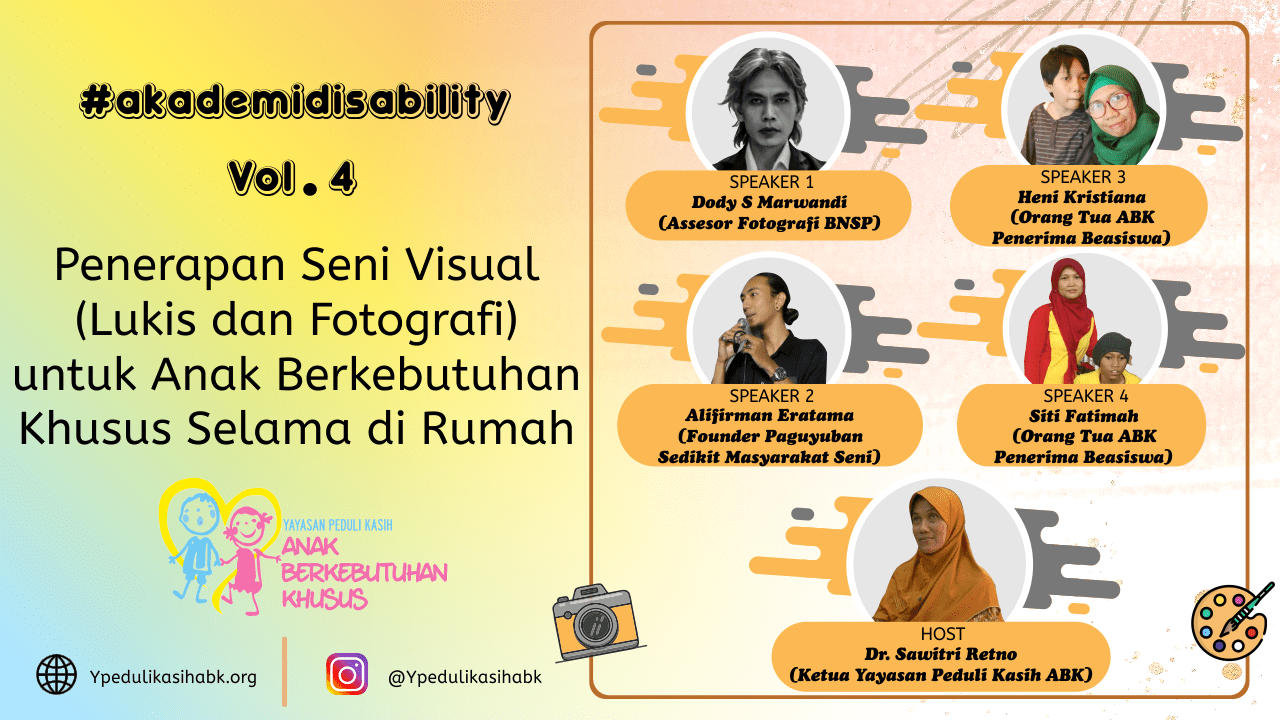 Pada Hari Minggu, 5 Juli 2020, Yayasan Peduli Kasih ABK menggelar webinar #Akademidisability volume ke 4 dengan judul Penerapan Seni