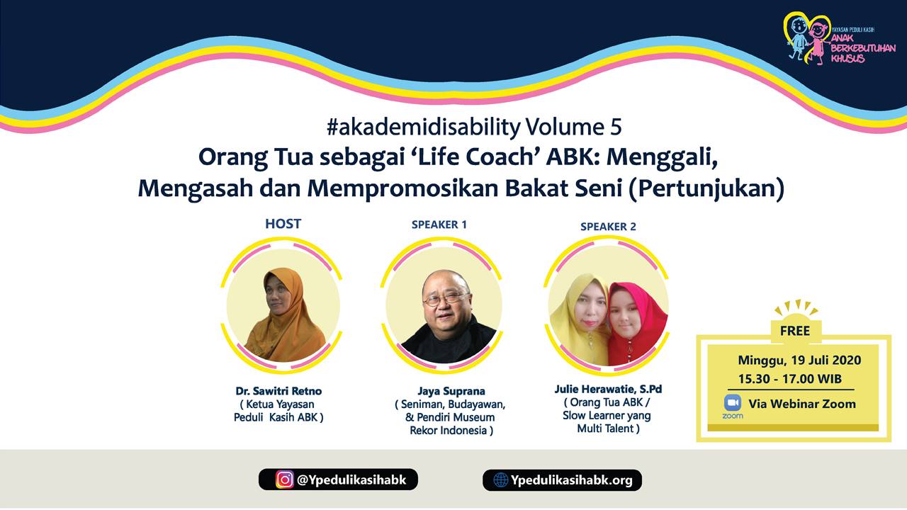 Yayasan Peduli Kasih ABK kembali menggelar webinar #Akademidisability ke lima pada Hari Minggu, 19 Juli 2020. Webinar ini bertema Orang