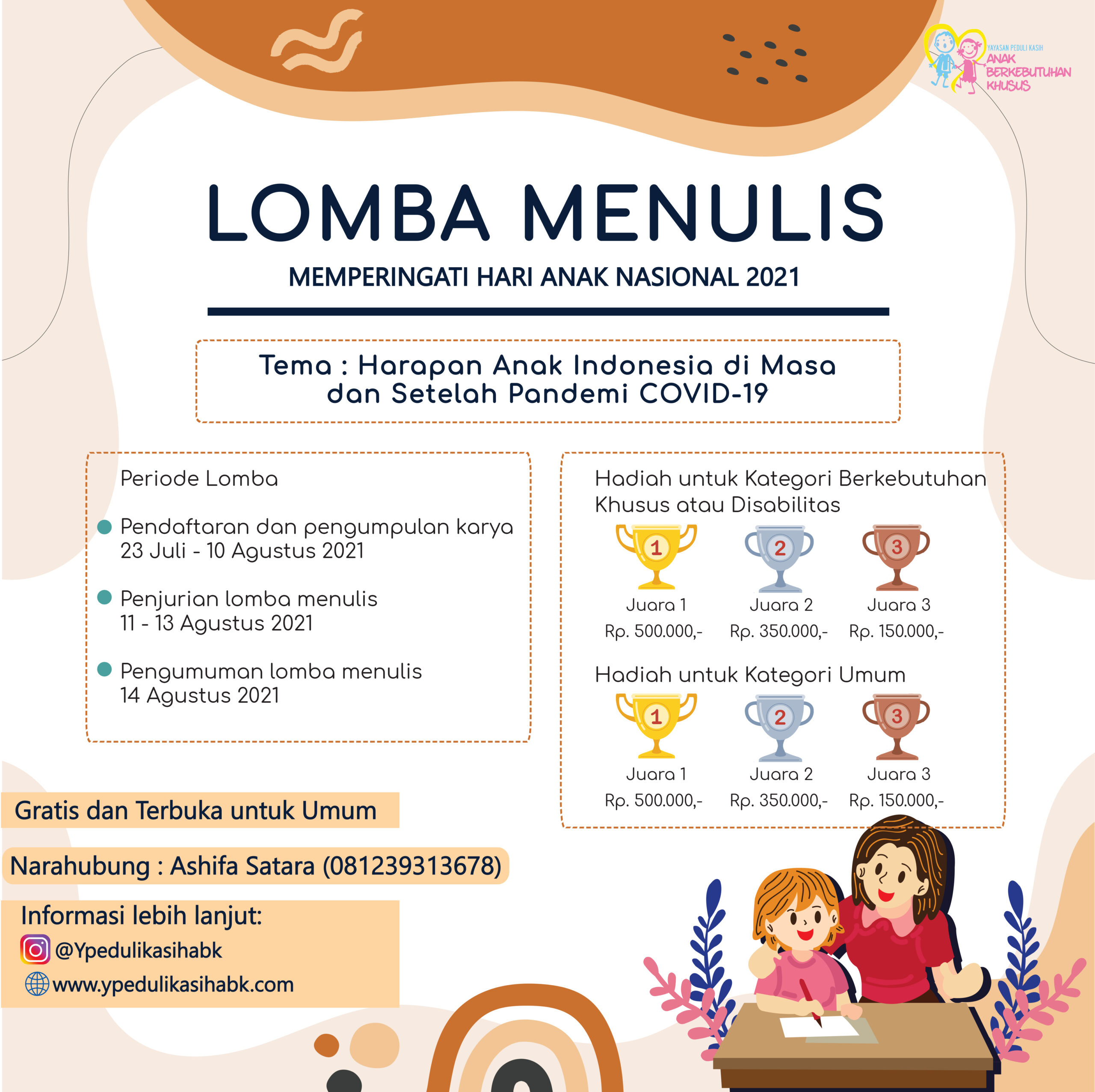 Dalam rangka memperingati Hari Anak Nasional 2021, Yayasan Peduli Kasih Anak Berkebutuhan Khusus mengadakan Lomba Menulis dengan tema: Harapan Anak